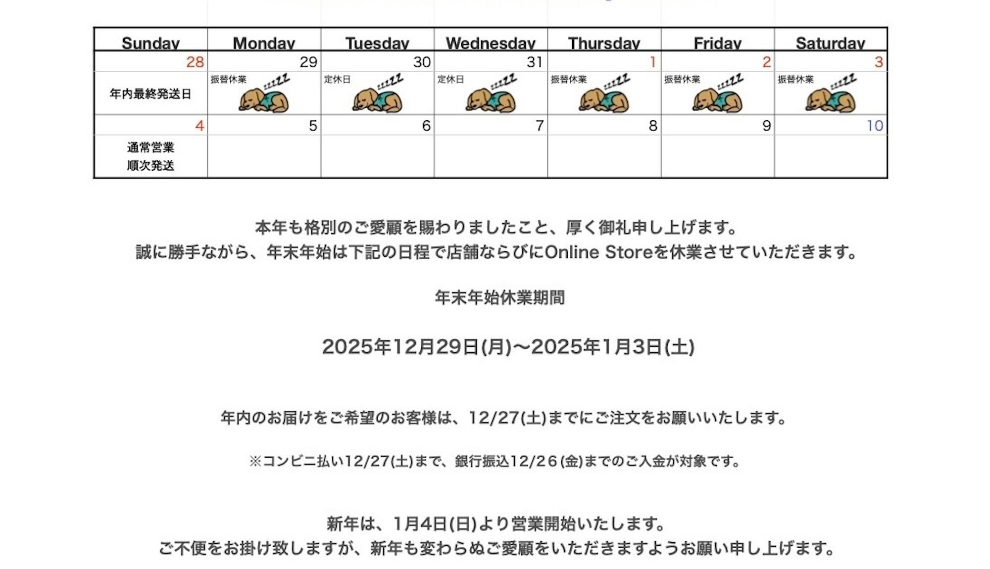 年末年始の休業ならびに配送についてのお知らせ